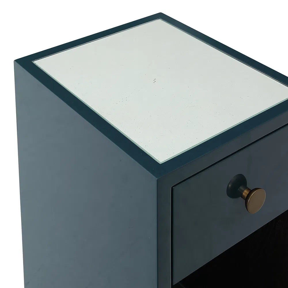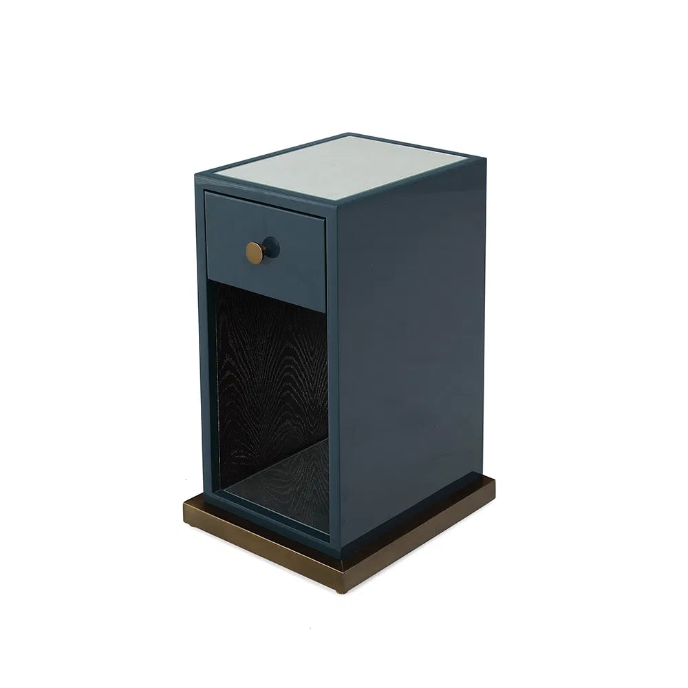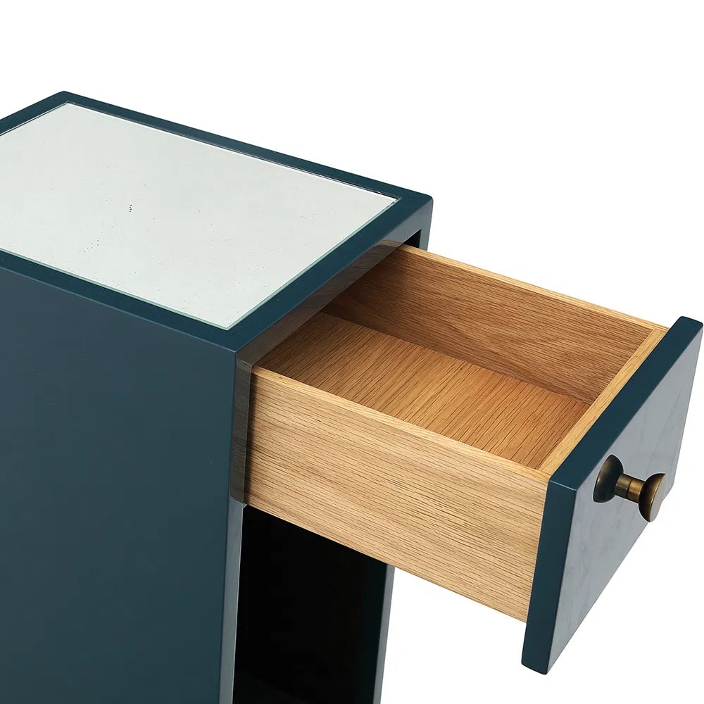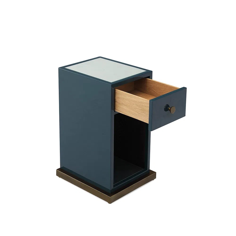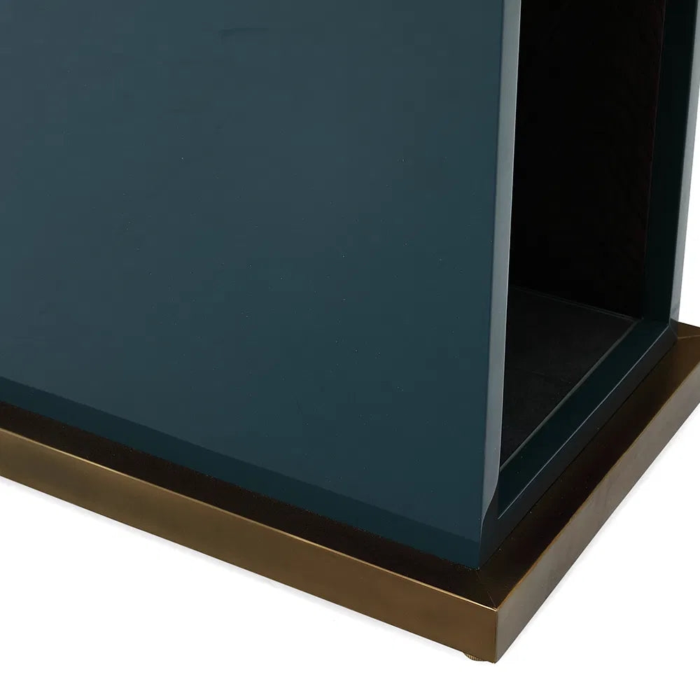 Rent-to-Own Can't bear to part with your piece? You can buy it at the end of your contract for £828. Description Julian Chichester blends traditional English craftsmanship with global inspiration, creating timeless furniture with a contemporary twist. Known for distinctive finishes, these artful pieces stand apart—more than furniture, they are statements of enduring design. This attractive, easy-to-use bedside is finished in a striking Ocean Blue Gloss Lacquer, featuring a shimmering Églomisé panel in the open section and accented with contrasting Aged Brass detail. The brass wrap is applied and beaten entirely by hand, resulting in a finish that is unique in both texture and appearance. Dimensions Height 60cm | Width 35cm | Depth 40cm