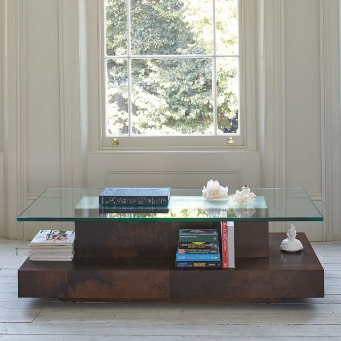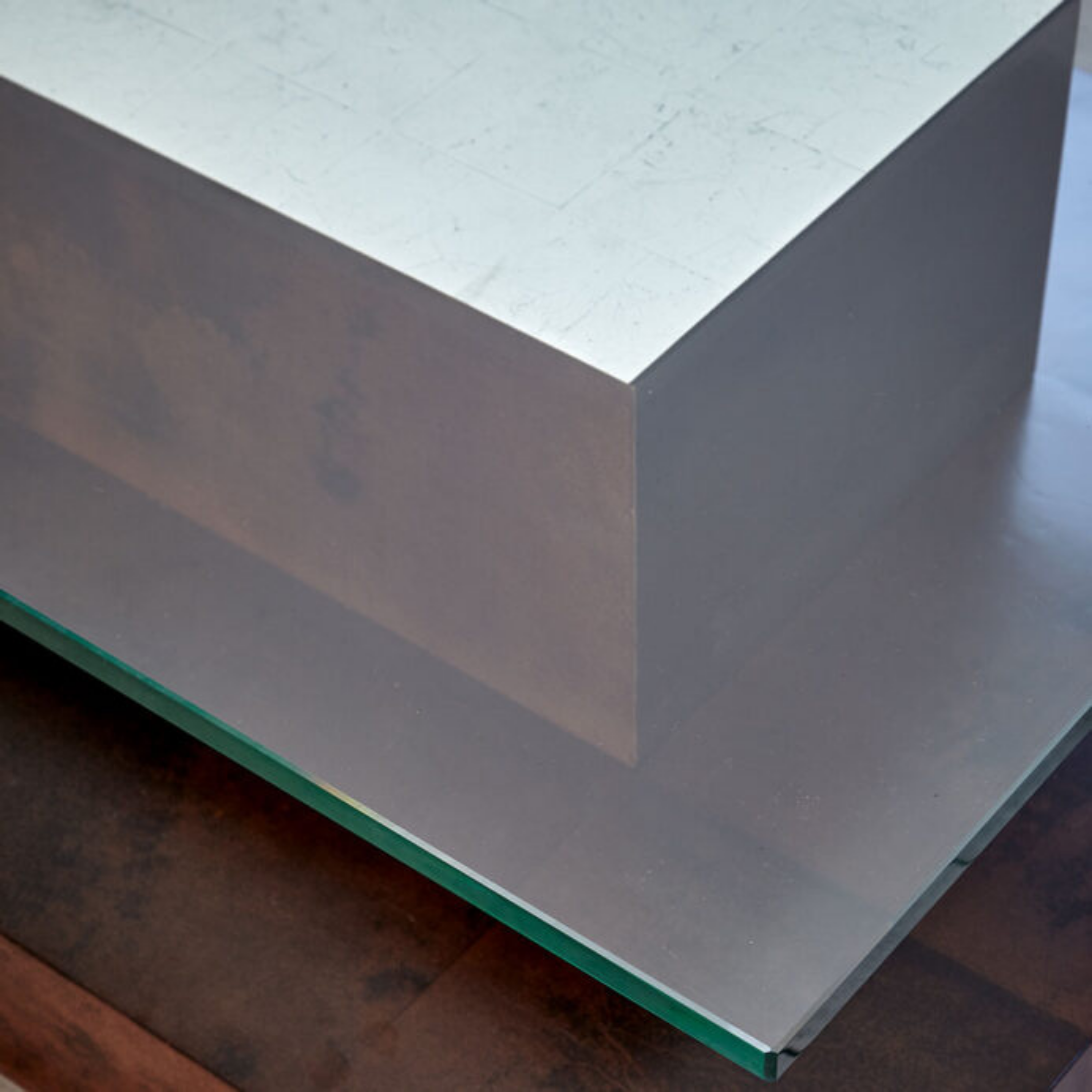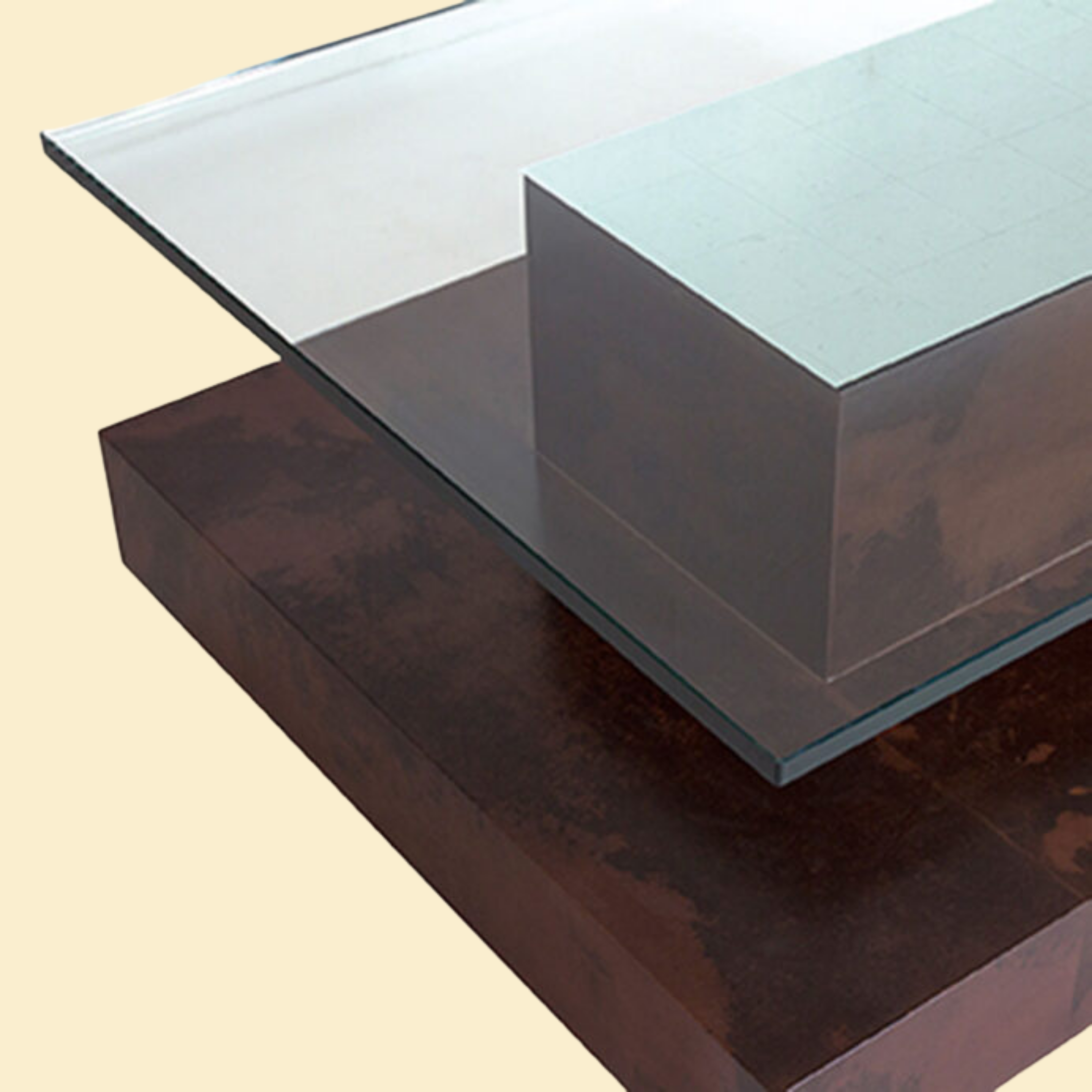 A 1970s style Variegated Dark Brown Vellum and floating Glass coffee table with interesting Verre Eglomise detail. Eglomise is hand-applied and unique in appearance. Vellum is a natural skin with no two pieces exactly alike, therefore variation in shade and tone along with physical characteristics are inevitable and may change over time. Height 45cm | Width 150cm | Depth 85cm