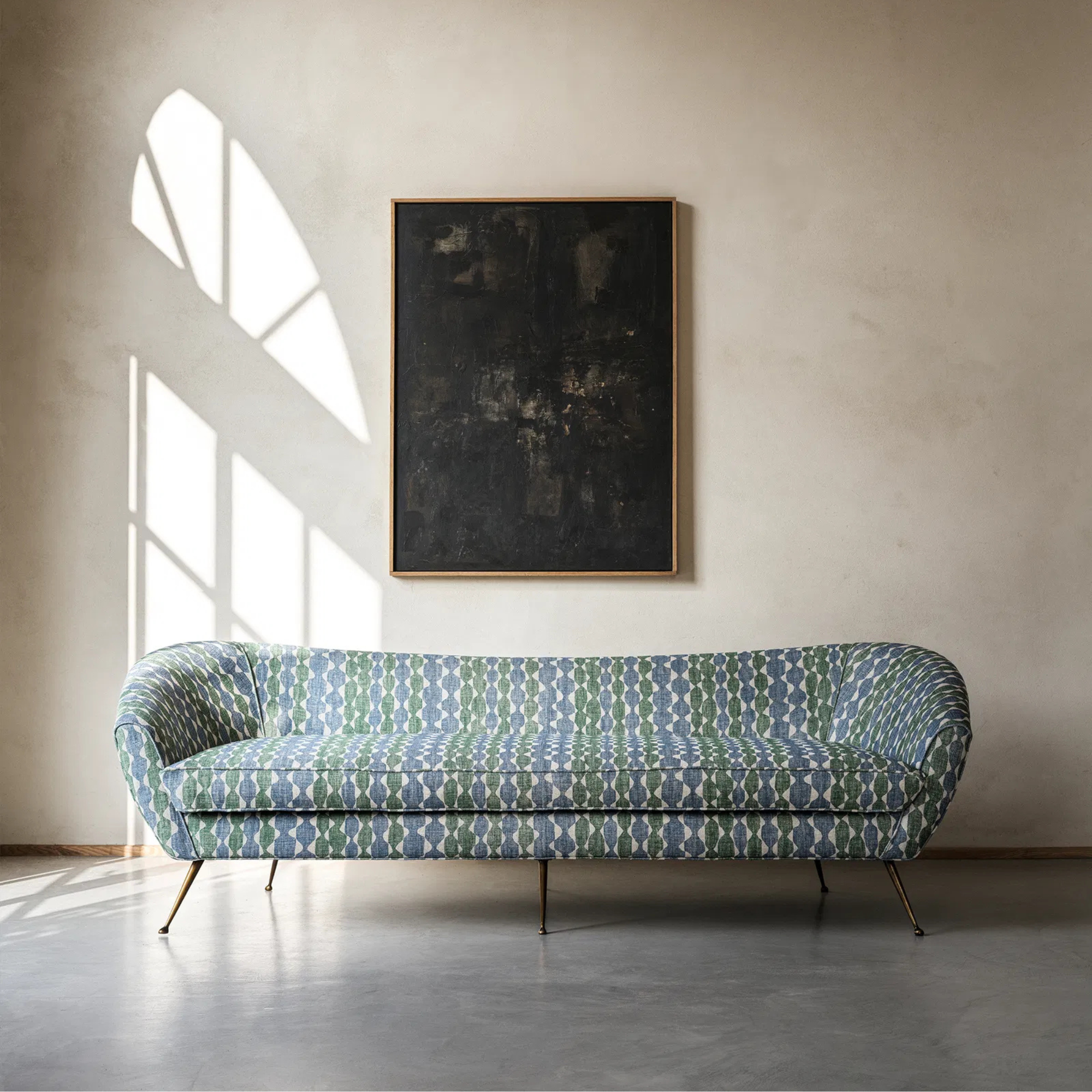 Description Stylish, fun and quirky sofa with slightly curved back, on angled brass legs. Brass is painted and moulded by hand giving unique in appearance and texture. Overall Dimensions Height 75cm | Width 235cm | Depth 85cm Seat Dimensions: Height 40cm *upholstery on items has 6 week lead time*