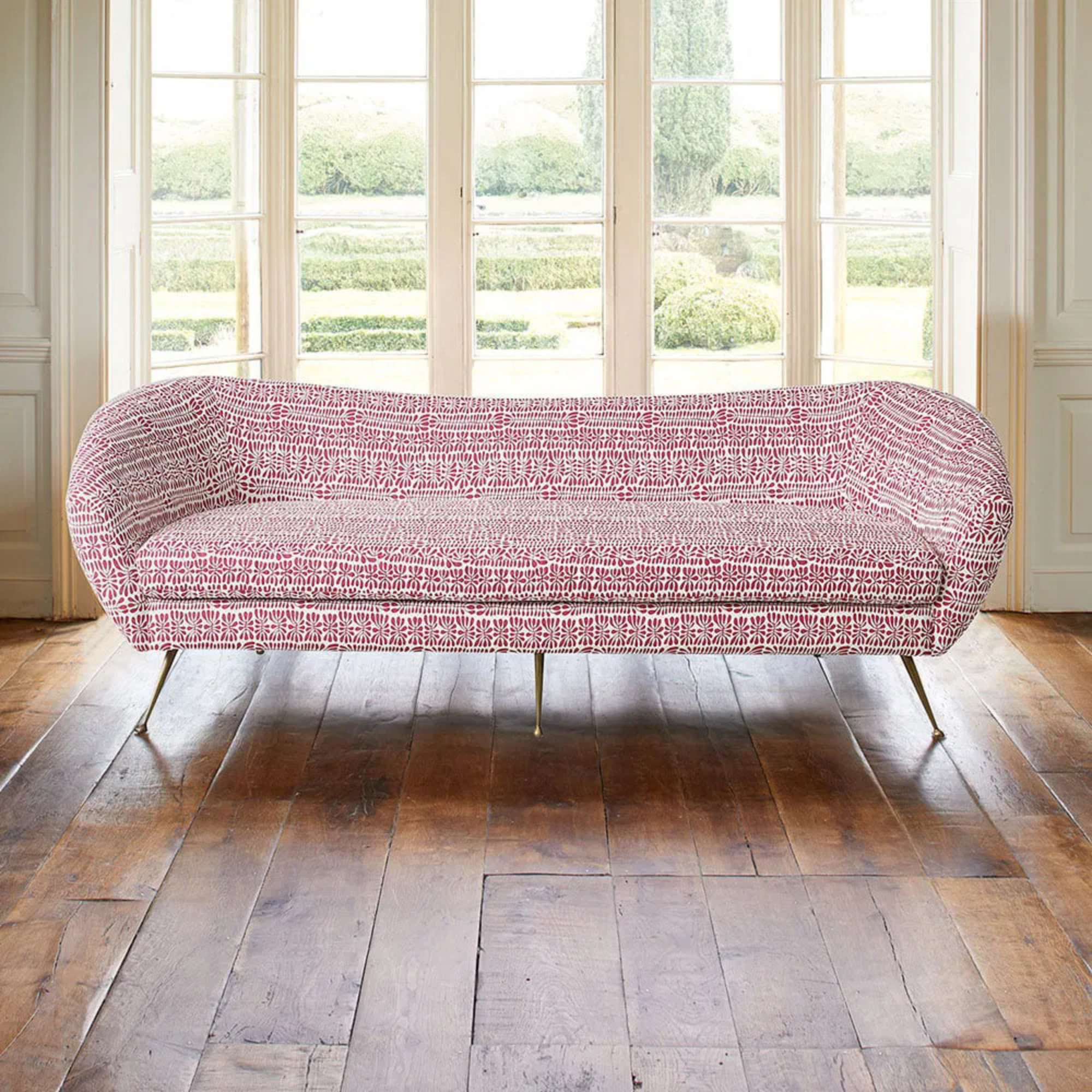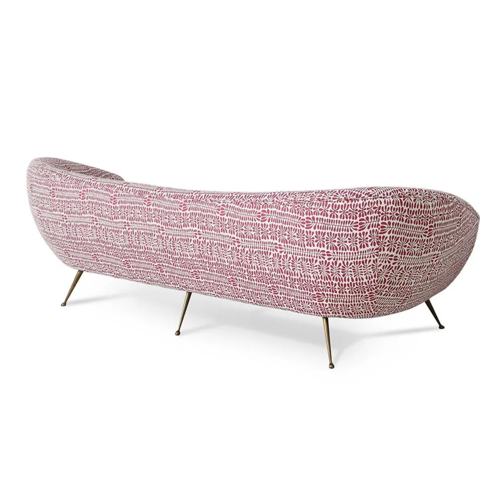 Description Stylish, fun and quirky sofa with slightly curved back, on angled brass legs. Brass is painted and moulded by hand giving unique in appearance and texture. Overall Dimensions Height 75cm | Width 235cm | Depth 85cm Seat Dimensions: Height 40cm *upholstery on items has 6 week lead time*