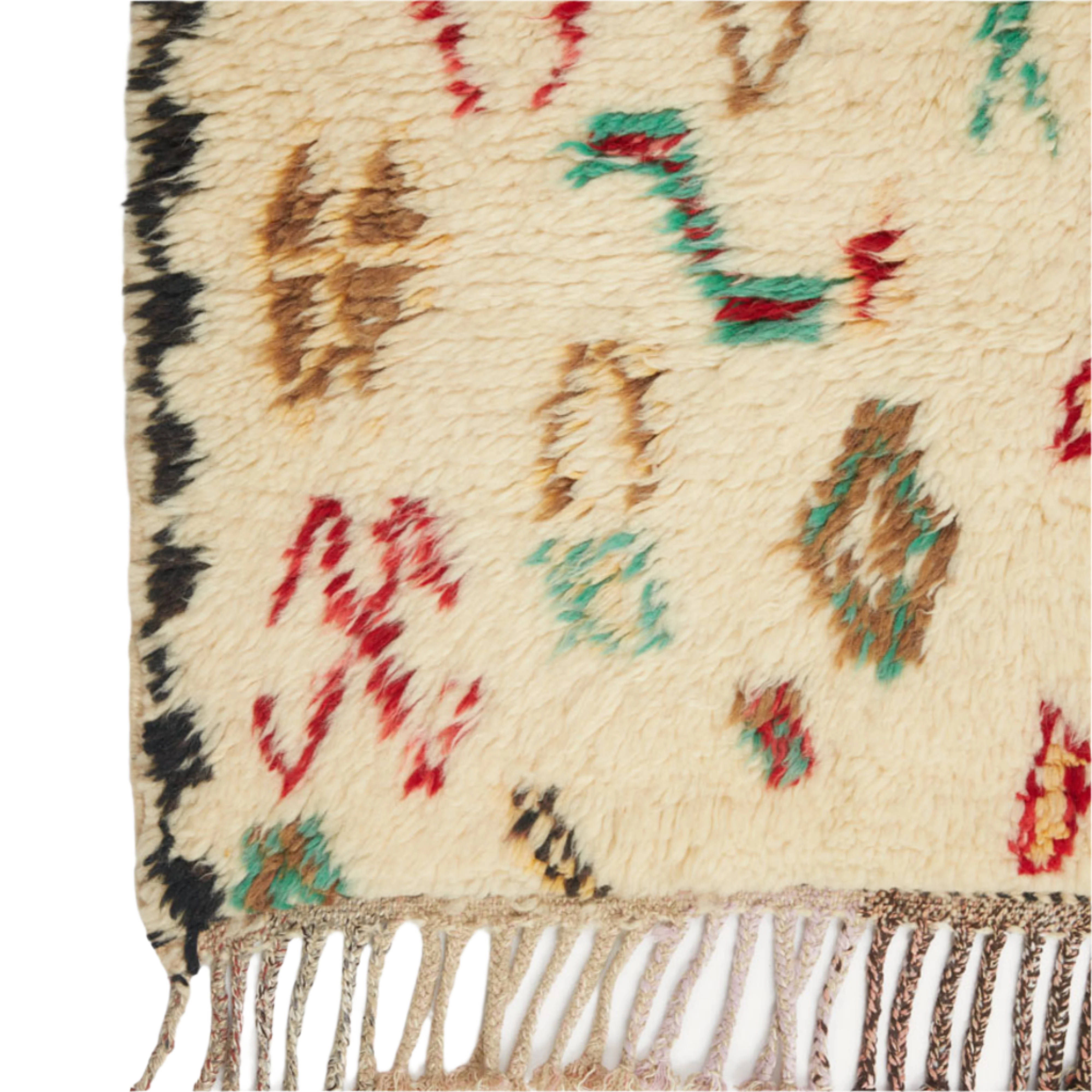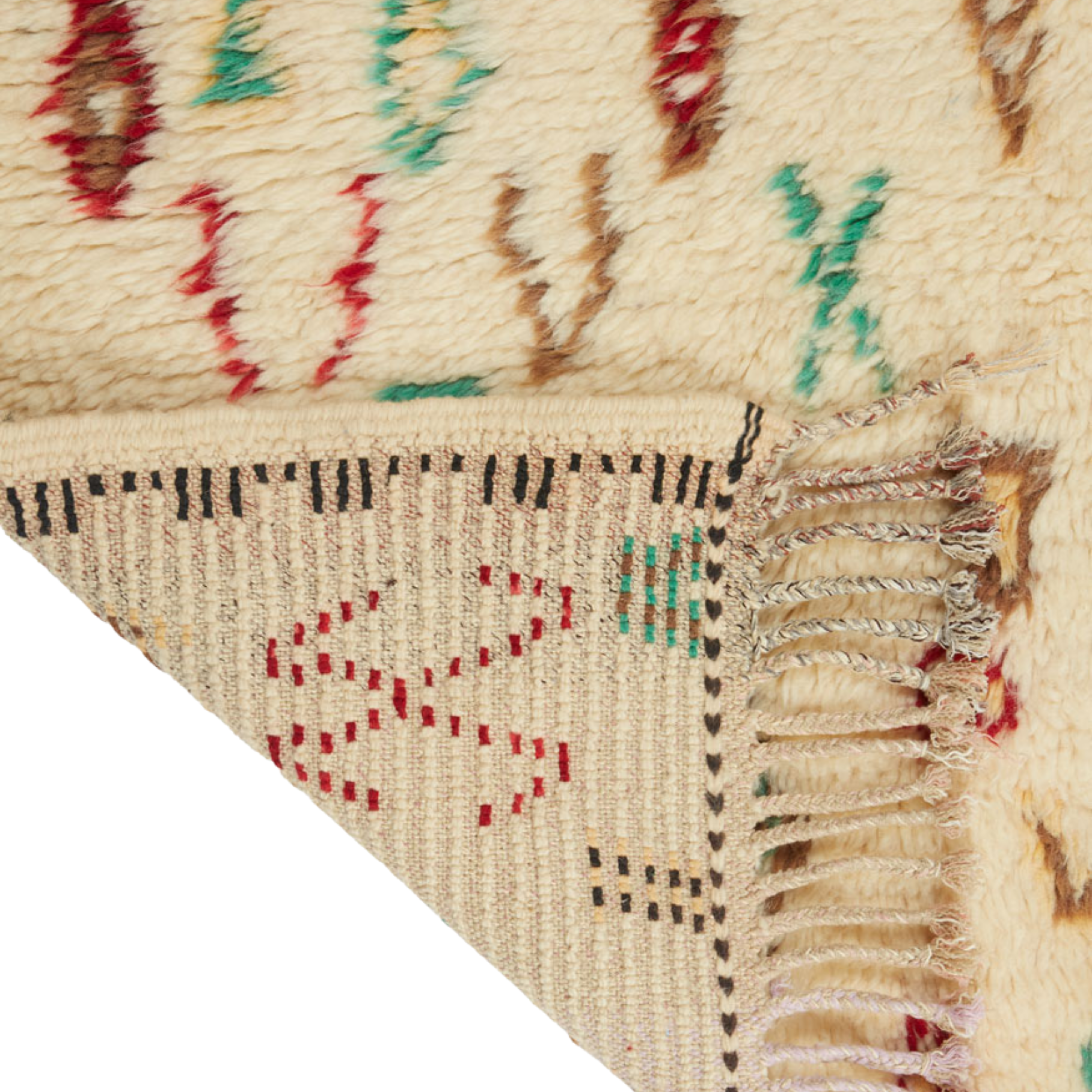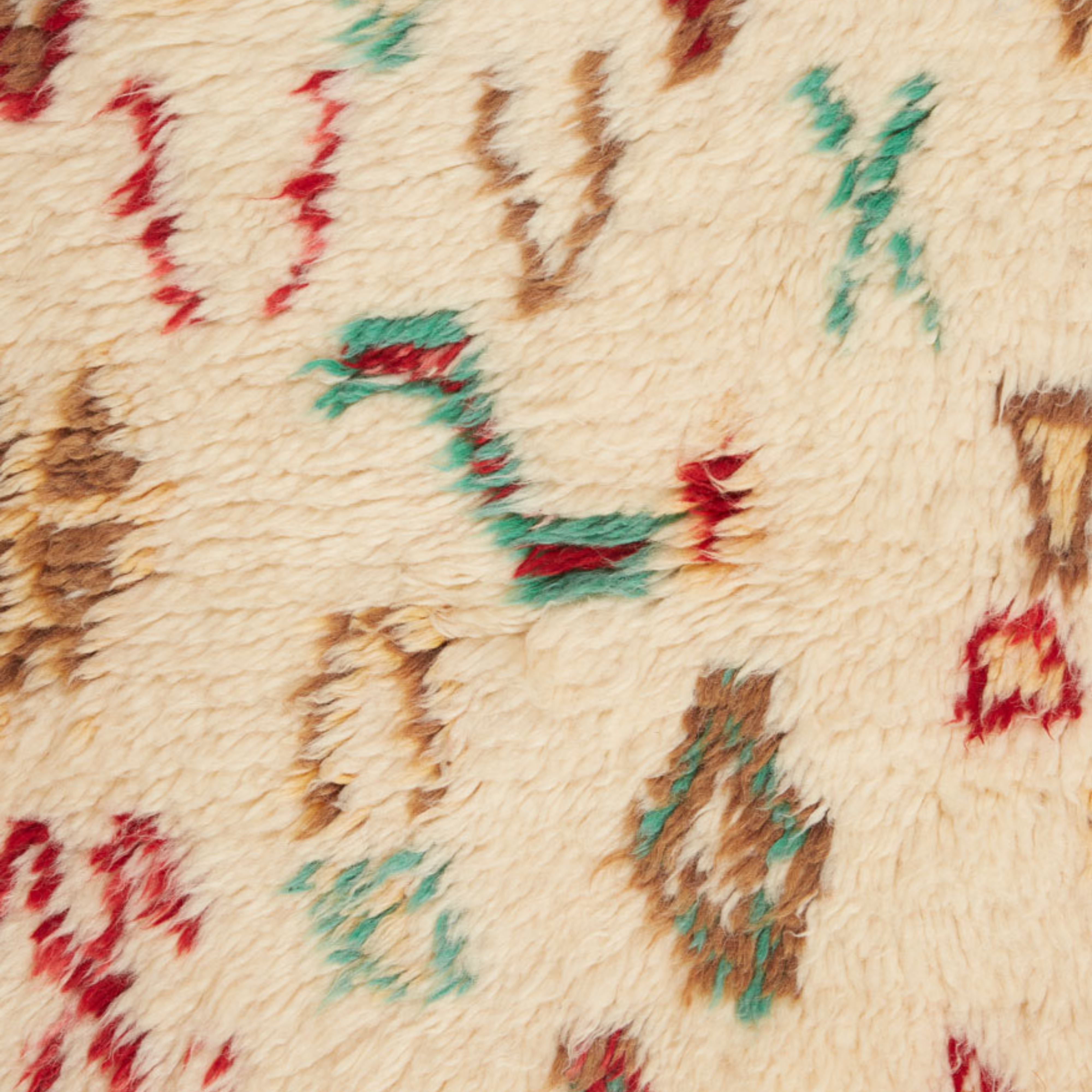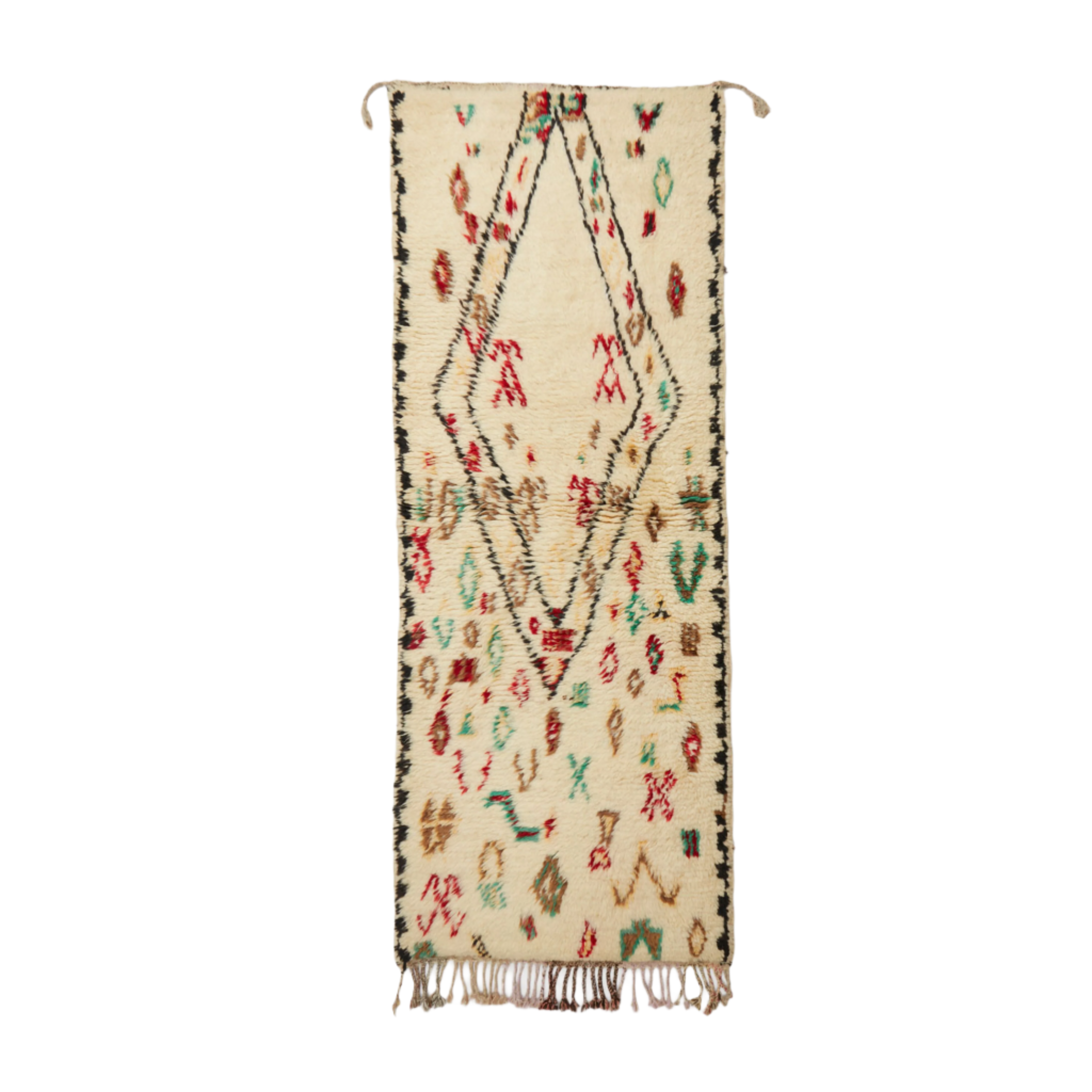 Description Rug from the region of Azilal in Morocco, featuring a soft natural cream background with red, green and toffee accents. Amazigh rugs are originally handmade by Amazigh women, who have learnt the skill of weaving from their mothers and grandmothers. Each piece is unique and carries the personal story of its weaver. This rug has strong character that shows the beautiful imperfections, reminiscent of the authenticity and slow craftmanship. 100% Wool. Dimensions Width 215cm | Length 82cm