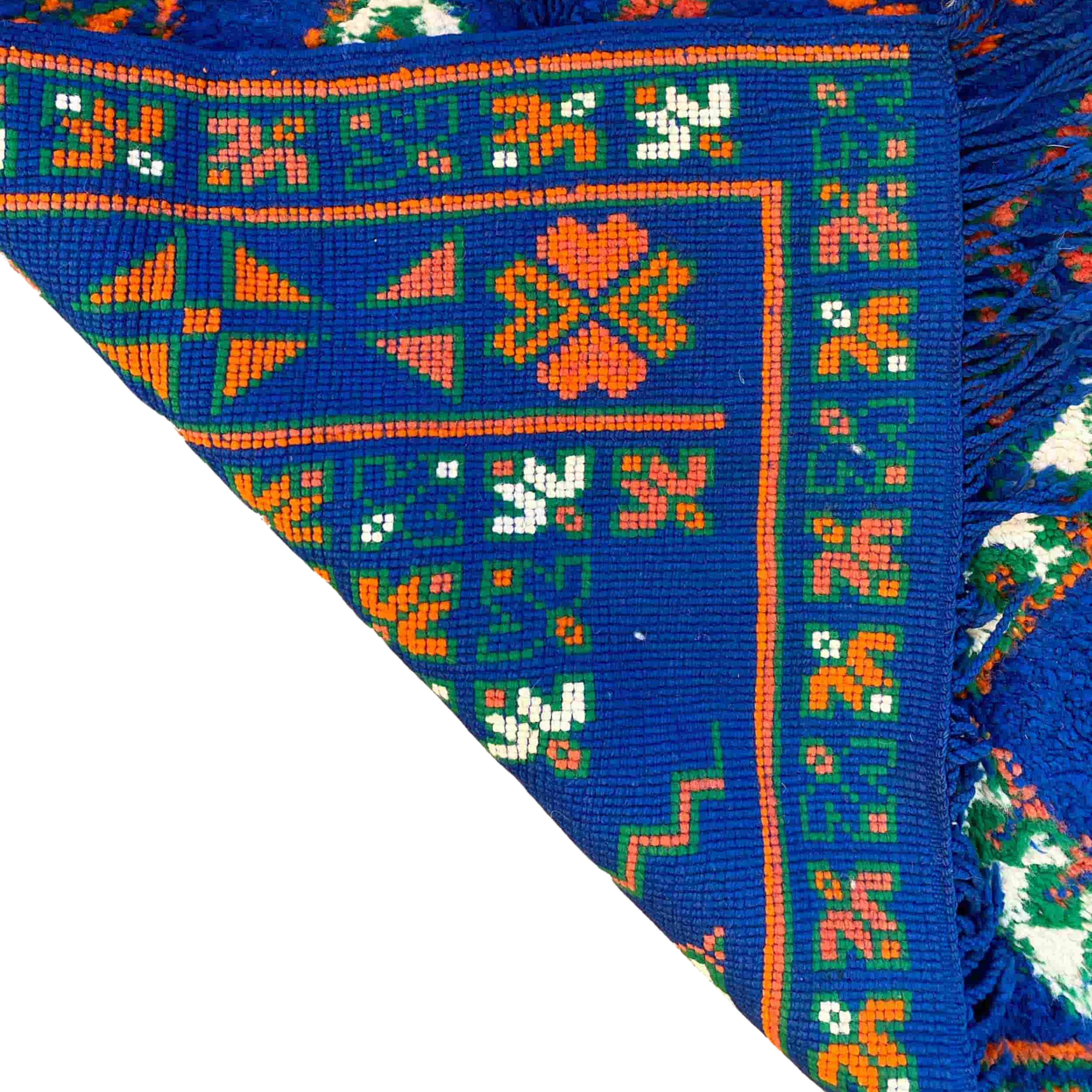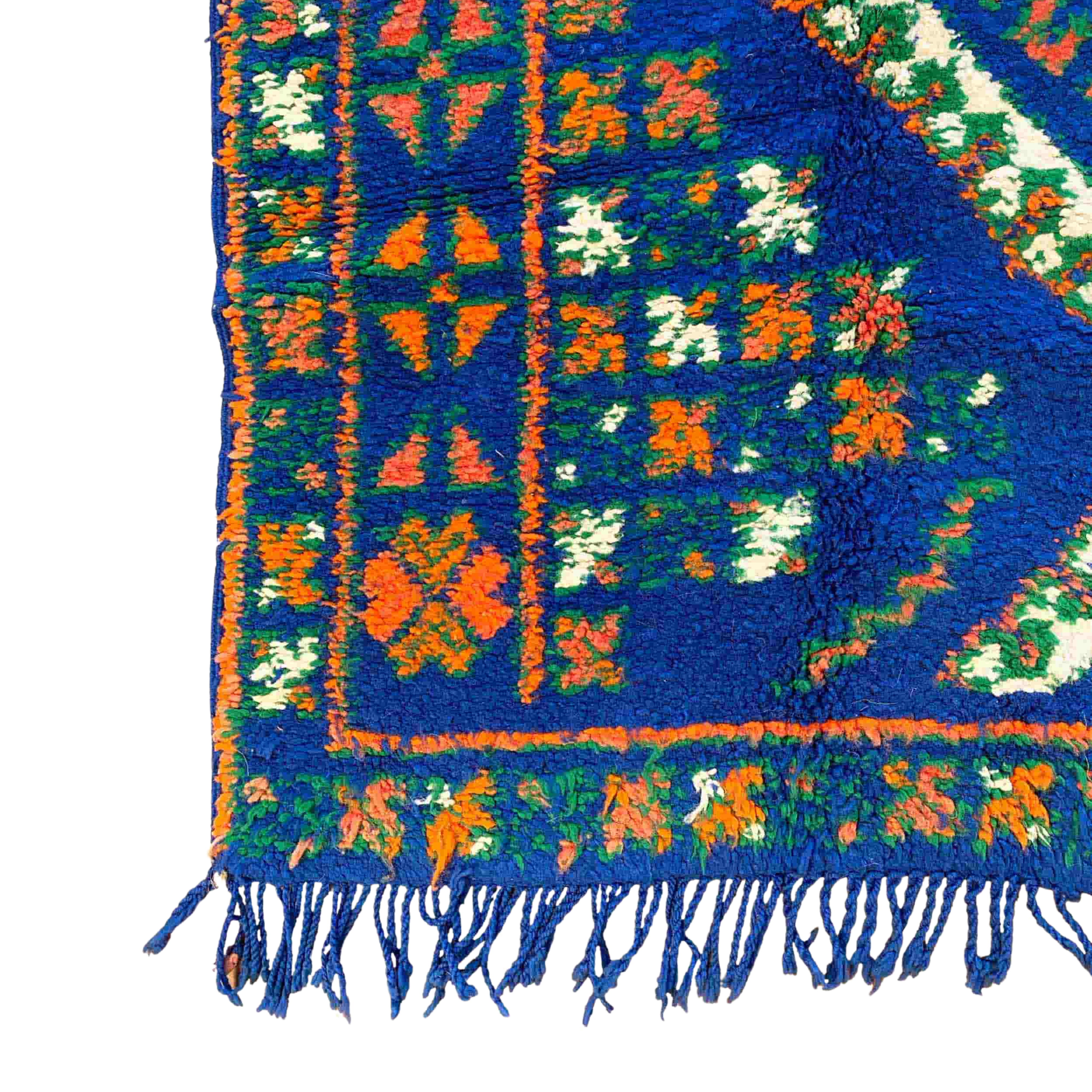 Description Statement rug from a small village near Ouarzazate in Morocco, featuring a indigo dyed natural wool - rare practise in Morocco today. Bold- surprisingly complimentary colours bring joy and into any space. Amazigh rugs are originally handmade by Amazigh women, who have learnt the skill of weaving from their mothers and grandmothers. Each piece is unique and carries the personal story of its weaver. This rug has strong character that shows the beautiful imperfections, reminiscent of the authenticity and slow craftmanship. 100% Wool. Dimensions Width 250cm | Length 120cm