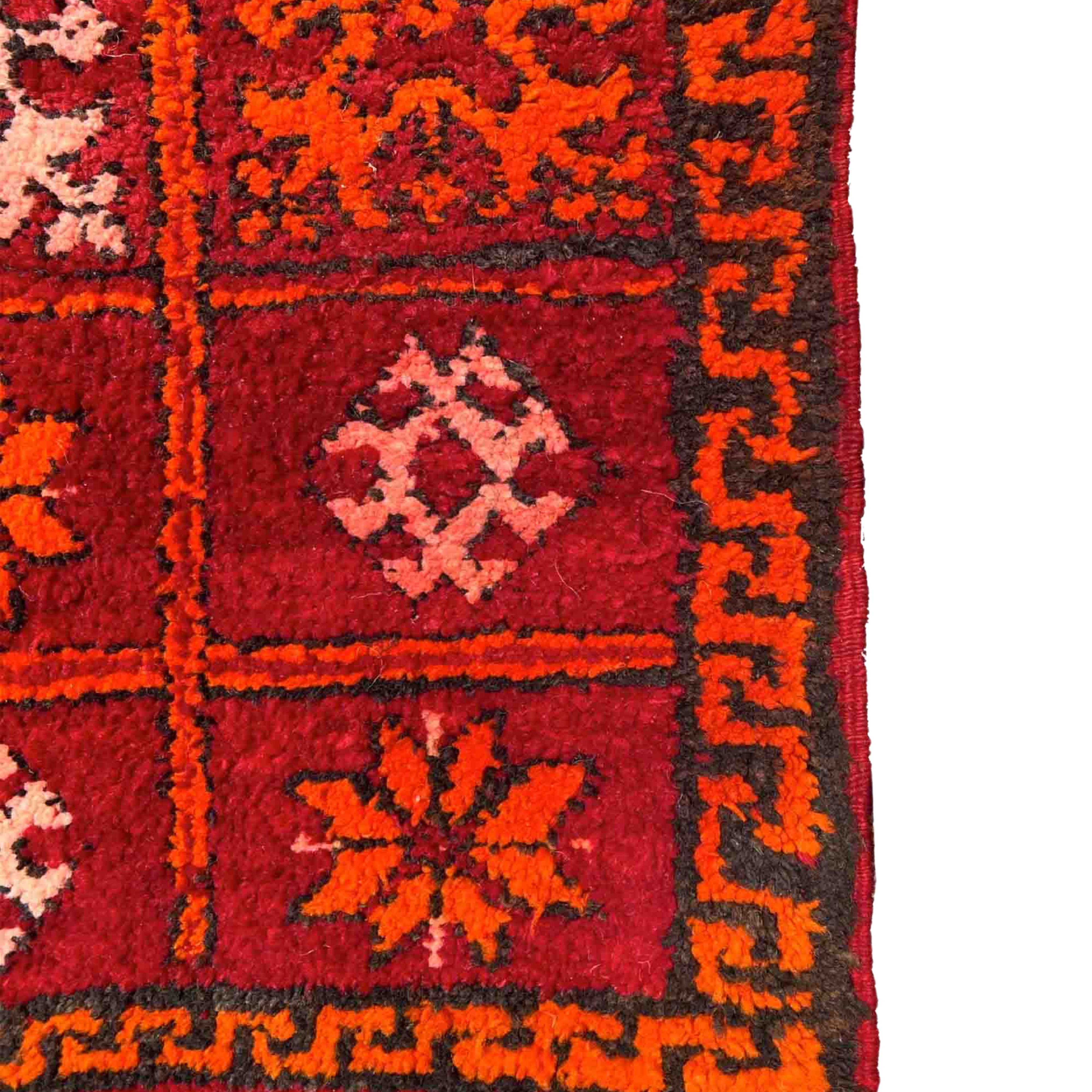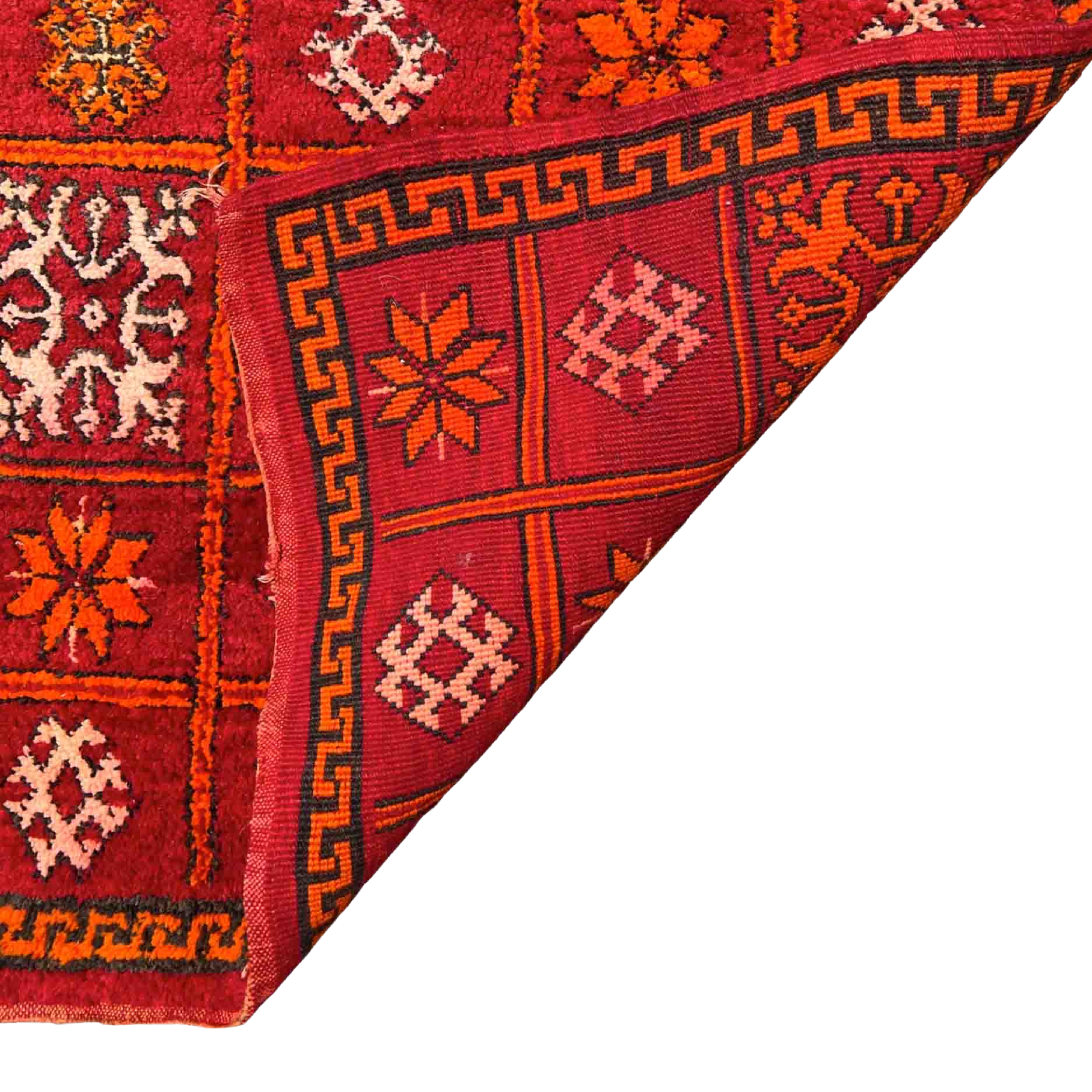 Description Rug from the region of Zemmour in Morocco, featuring a bold red background - which is commons from of textiles in this region. Signifies blossom and light and gives feeling of order and balance. Amazigh rugs are originally handmade by Amazigh women, who have learnt the skill of weaving from their mothers and grandmothers. Each piece is unique and carries the personal story of its weaver. This rug has strong character that shows the beautiful imperfections, reminiscent of the authenticity and slow craftmanship. 100% Wool. Dimensions Width 305cm | Length 145cm